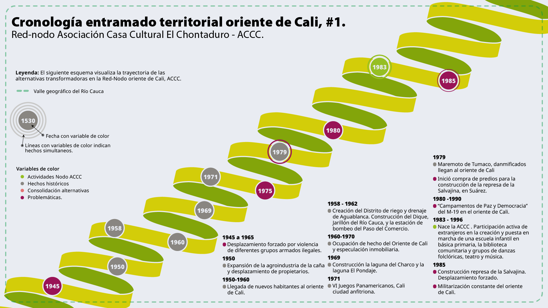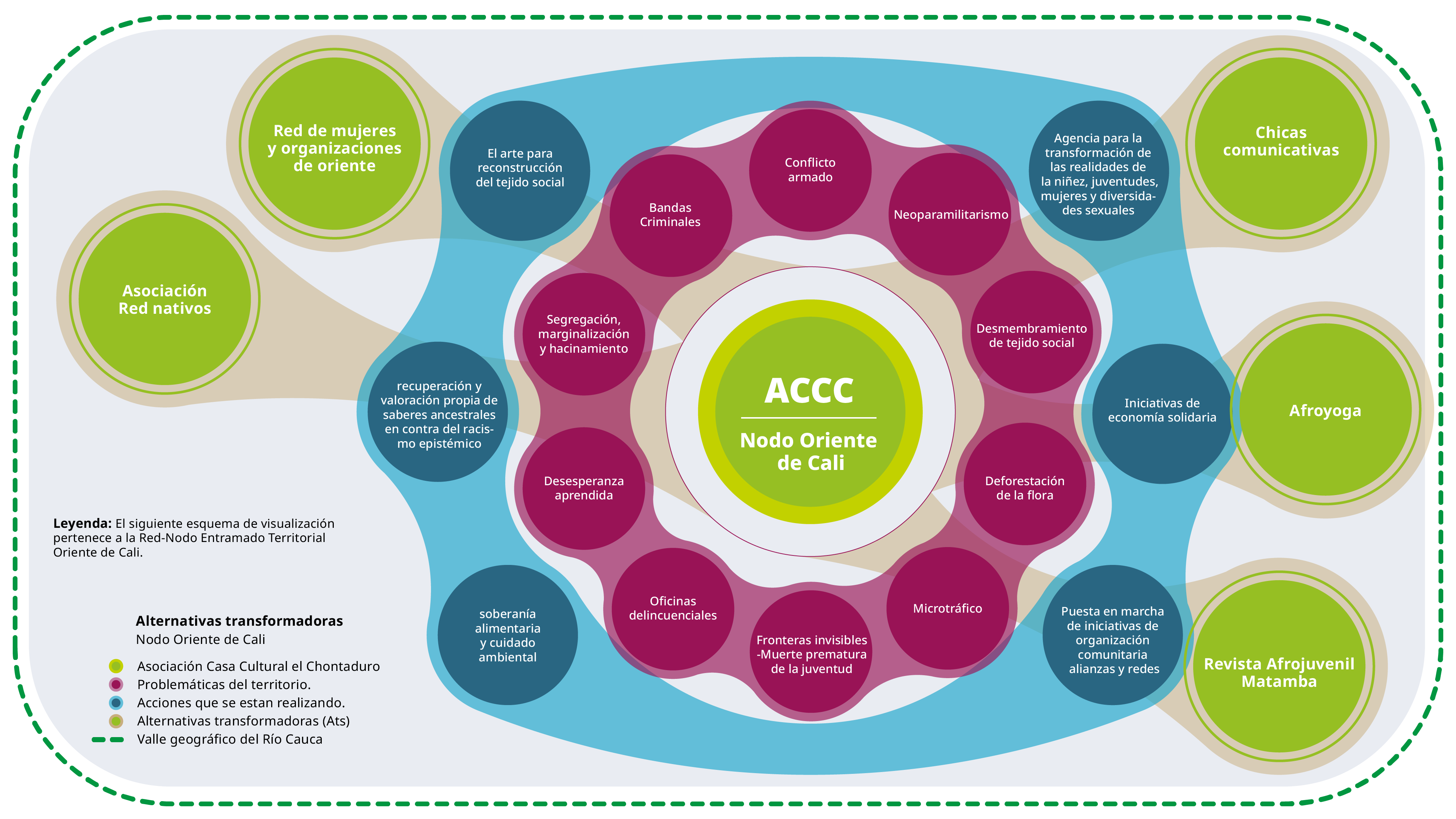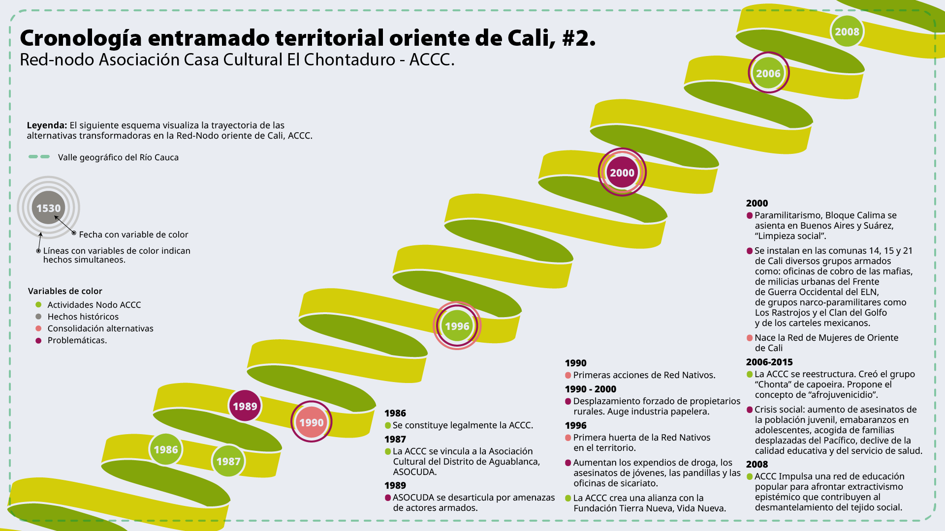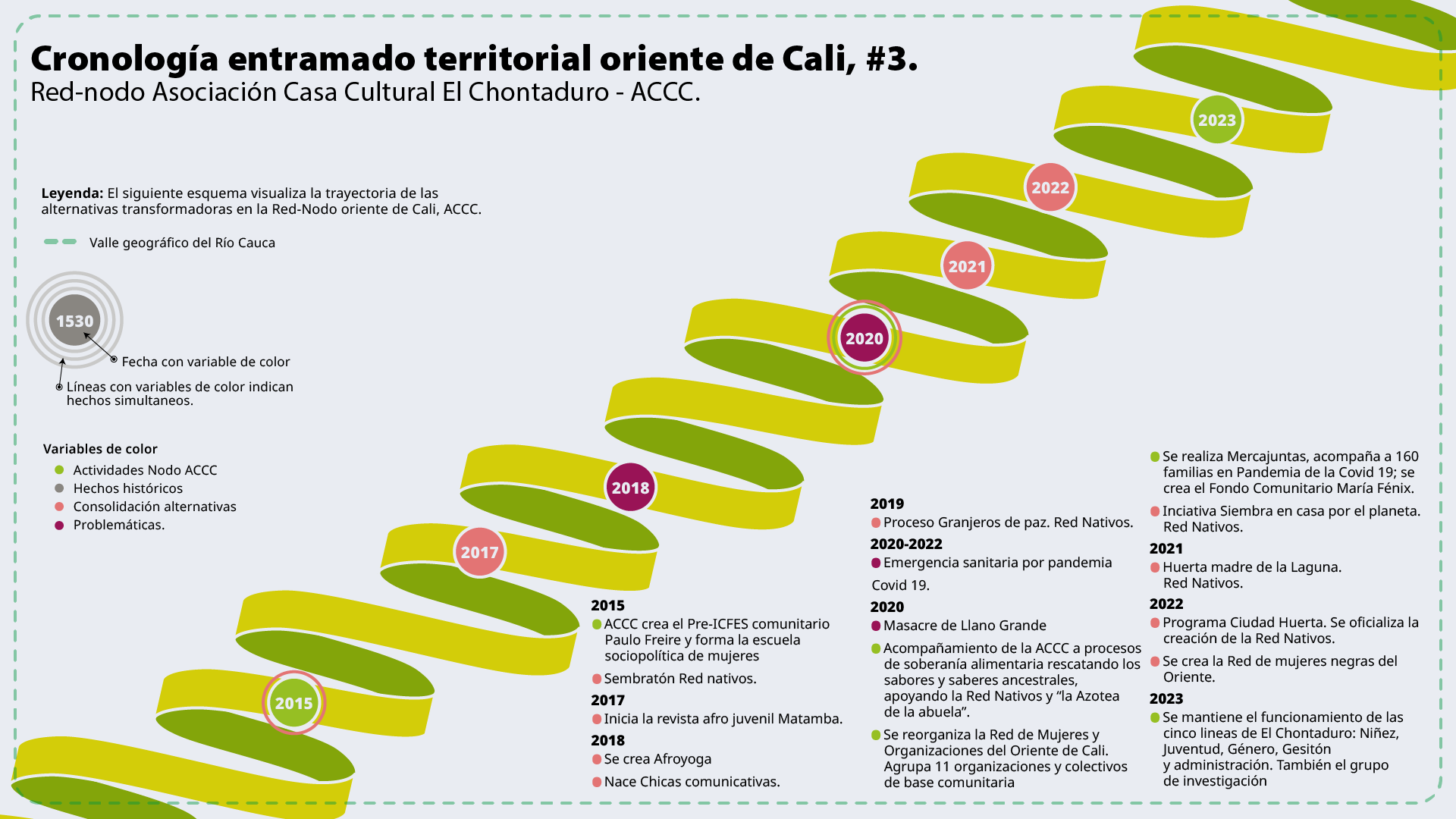 En este contexto, nace la Asociación Casa Cultural El Chontaduro –ACCC–, una asociación sin fines de lucro fundada en 1986 que surge como respuesta a las condiciones de exclusión y violencia estructural en el oriente de Cali. Nombrada en honor al chontaduro, fruto vital para las comunidades del Pacífico y sustento para muchas mujeres locales, la ACCC busca construir una gran familia comunitaria mediante la promoción de principios eco-feministas, de no-violencia y equidad de género.